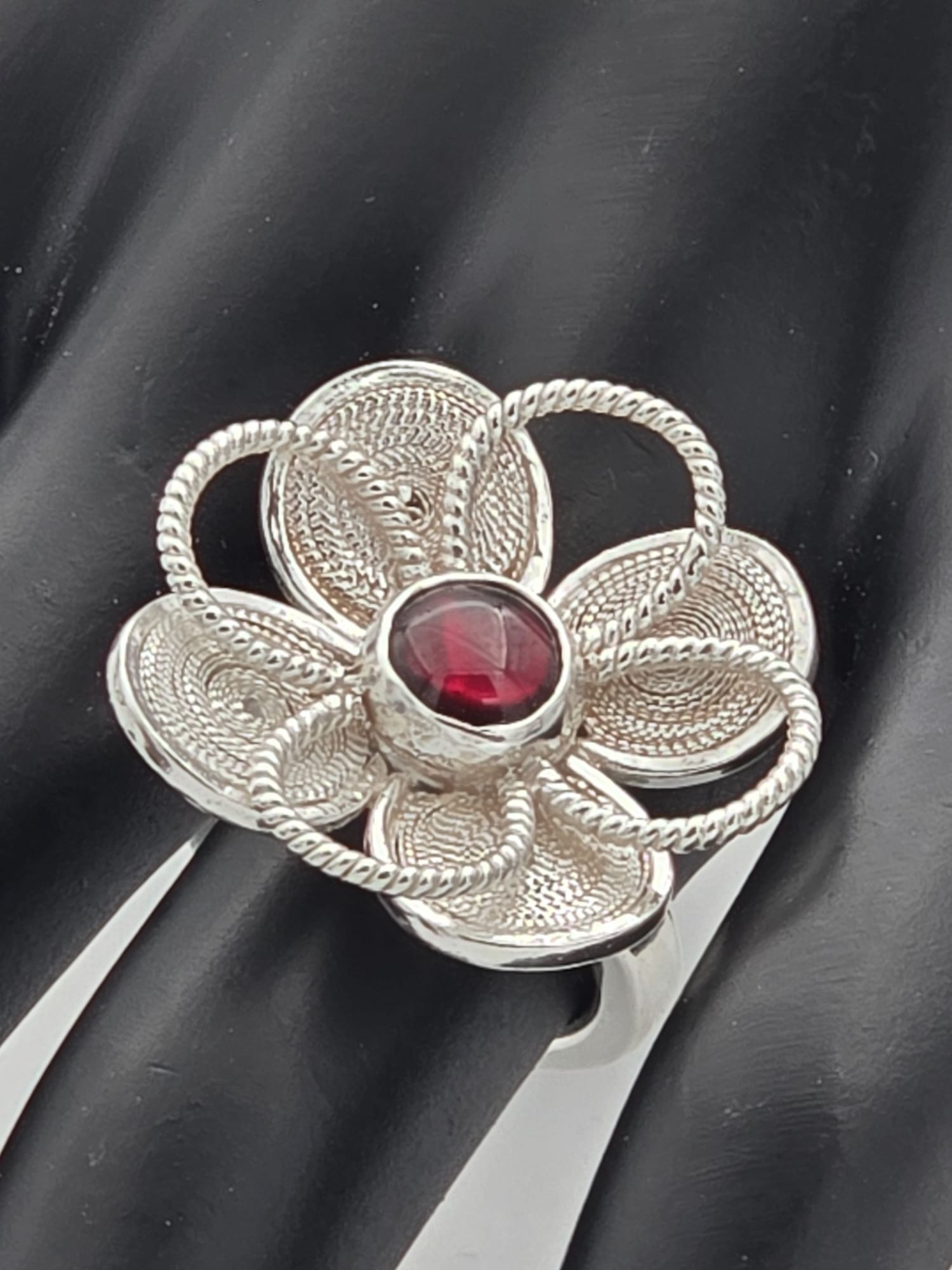 The Crimson Flower ring is a jewel that blooms from the perfection of detail. Forged in 999 silver threads using artisanal filigree technique, each petal intertwines with precision, creating a balance between delicacy and character.