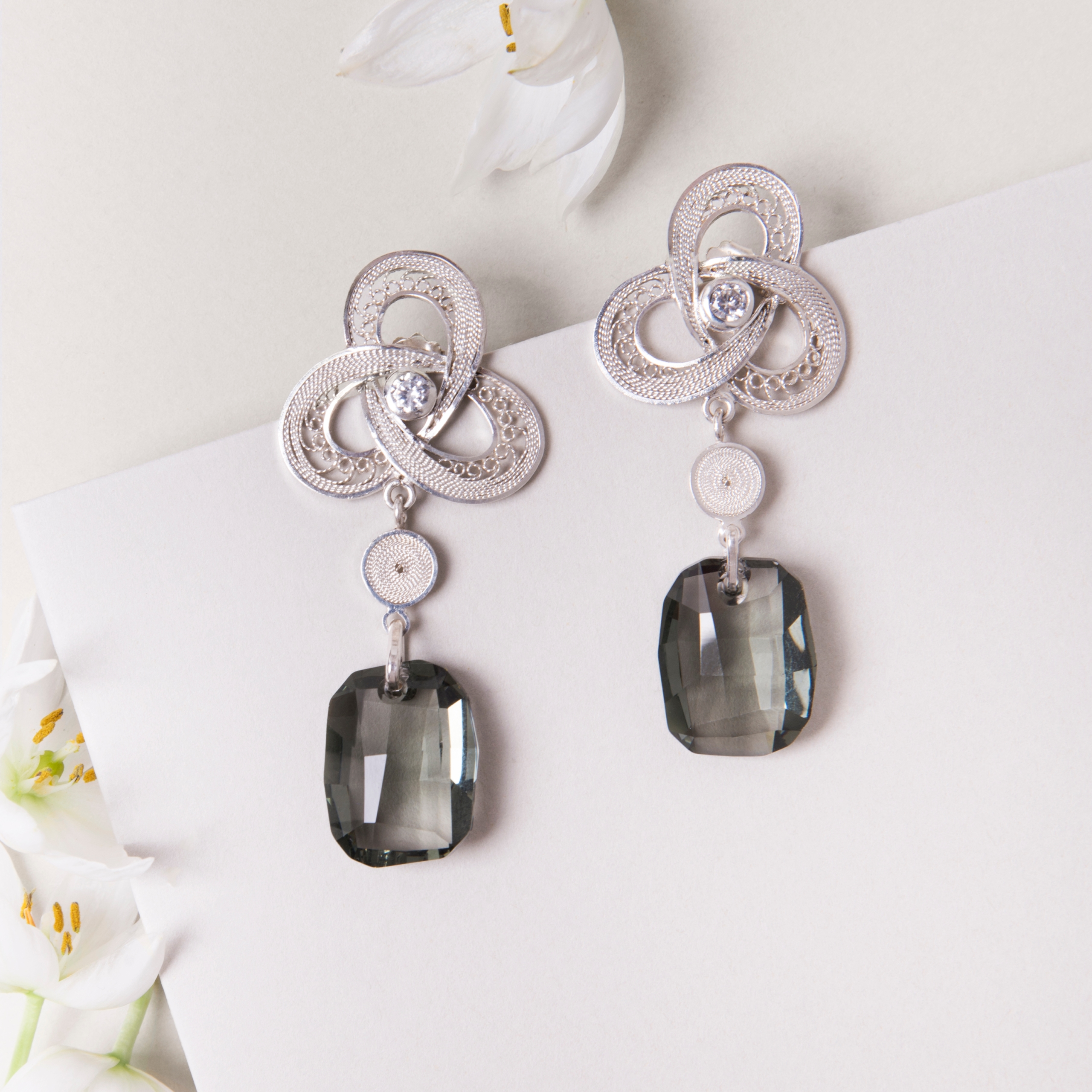 Each earring is handmade with exceptional mastery of goldsmithing, using the purest base: 999 Silver. The finish is achieved with a dazzling rectangular fantasy-cut Crystal of a deep gray color. The center of the design is illuminated with zir