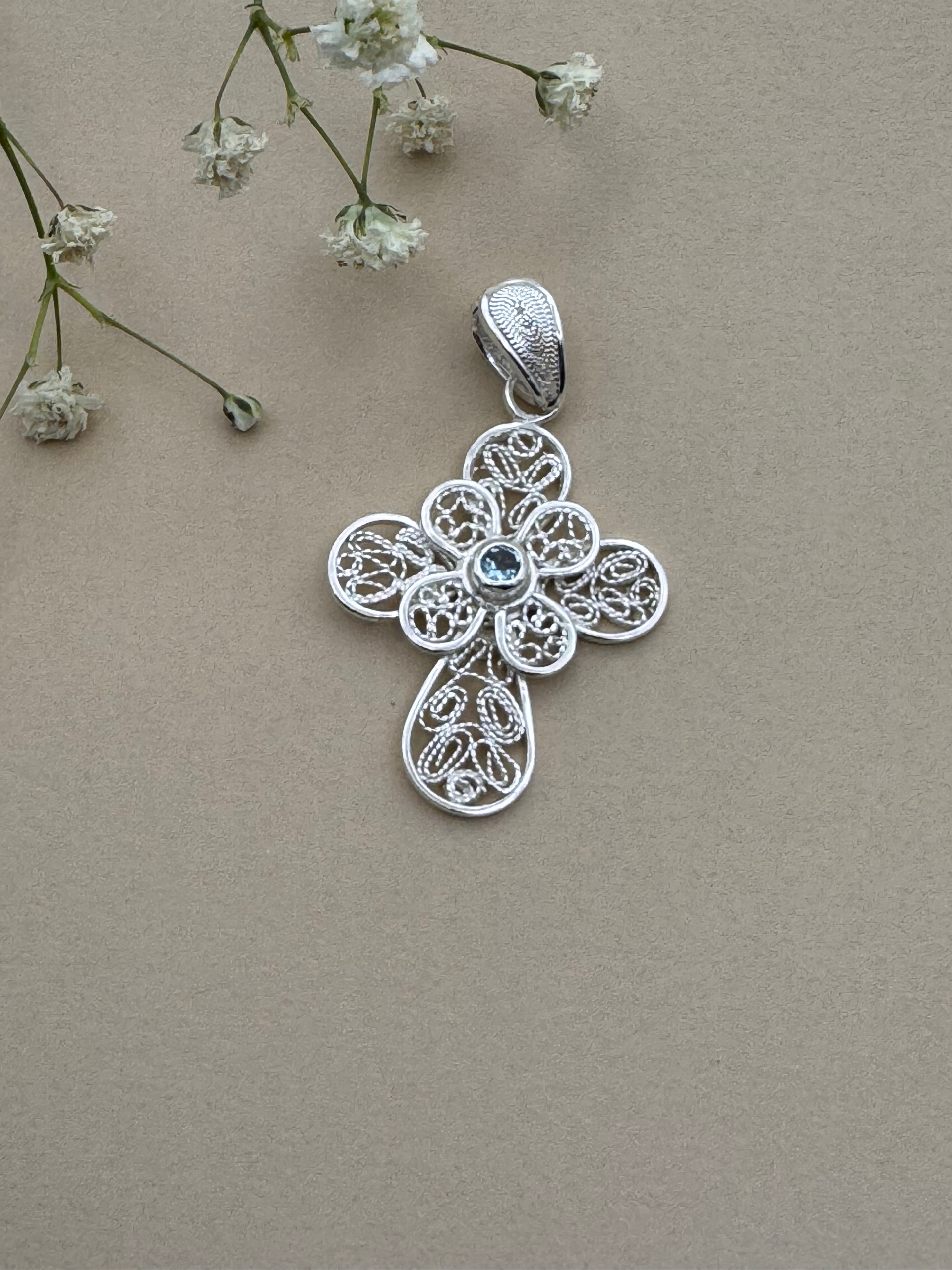 This cross is born from delicacy: petals that intertwine in filigree, holding in their center a blue topaz that reflects serenity and inner light.